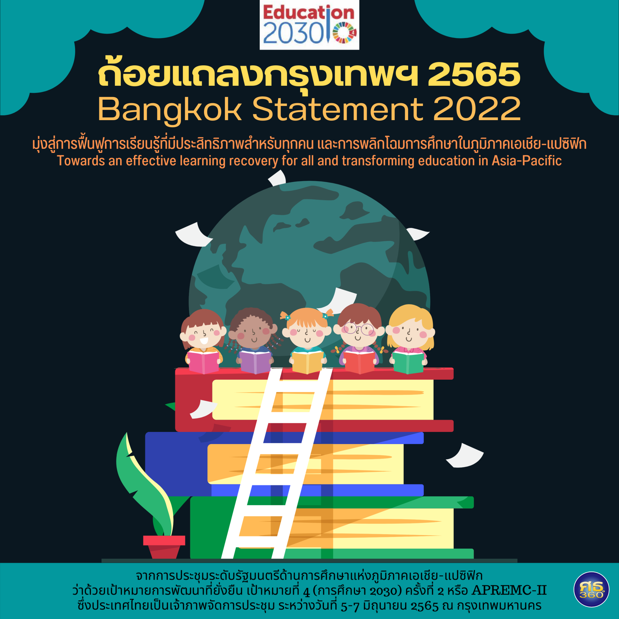 ถ้อยแถลงกรุงเทพฯ 2565 (Bangkok Statement 2022) จากการประชุม APREMC-II “ถ้อยแถลงกรุงเทพฯ 2565 (Bangkok Statement 2022) มุ่งสู่การฟื้นฟูการเรียนรู้ที่มีประสิทธิภาพสำหรับทุกคนและการพลิกโฉมการศึกษาในภูมิภาคเอเชีย-แปซิฟิก” ซึ...