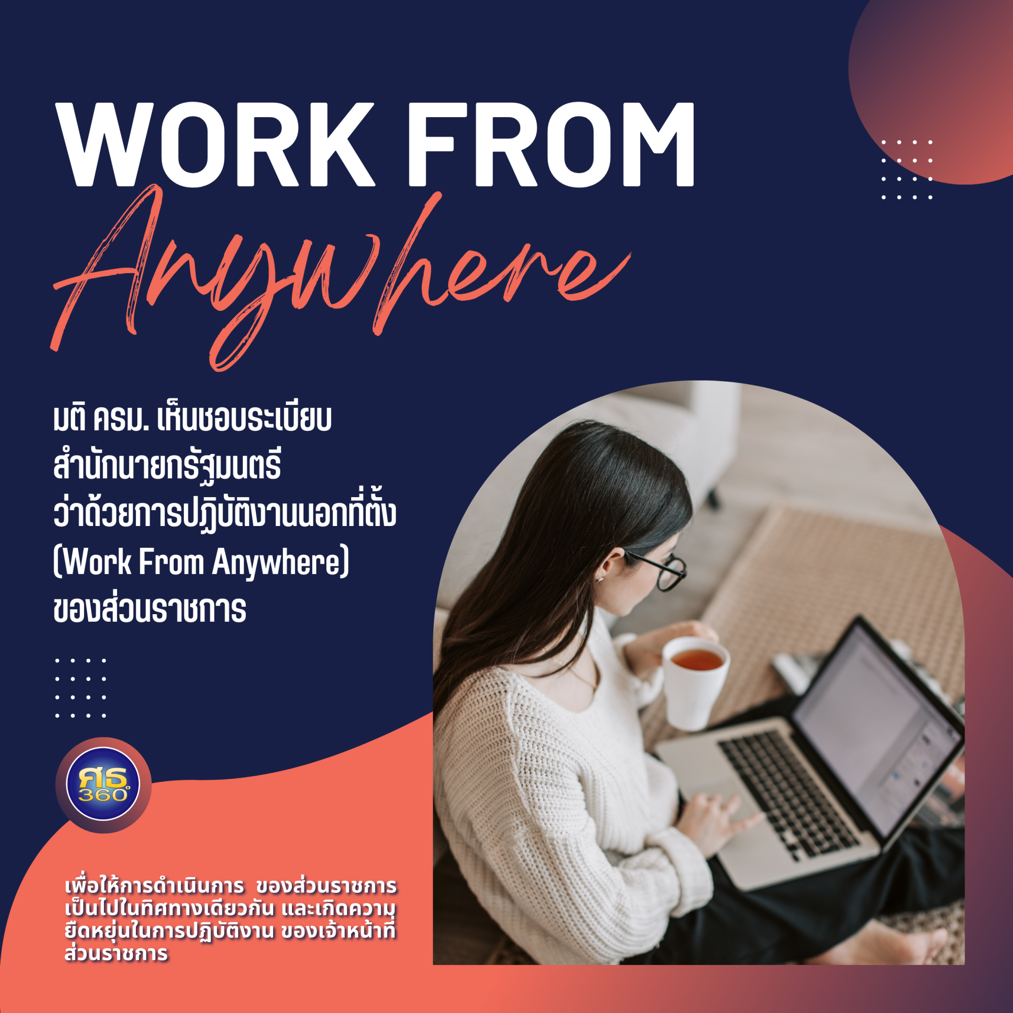 ครม.เห็นชอบระเบียบสำนักนายกรัฐมนตรี ว่าด้วยการปฏิบัติงานนอกที่ตั้ง (Work From Anywhere) ของส่วนราชการ มติคณะรัฐมนตรี เมื่อวันที่ 21 มิถุนายน 2565 เห็นชอบในหลักการร่างระเบียบสำนักนายกรัฐมนตรี ว่าด้วยการปฏิบัติงานนอกที่ตั้...