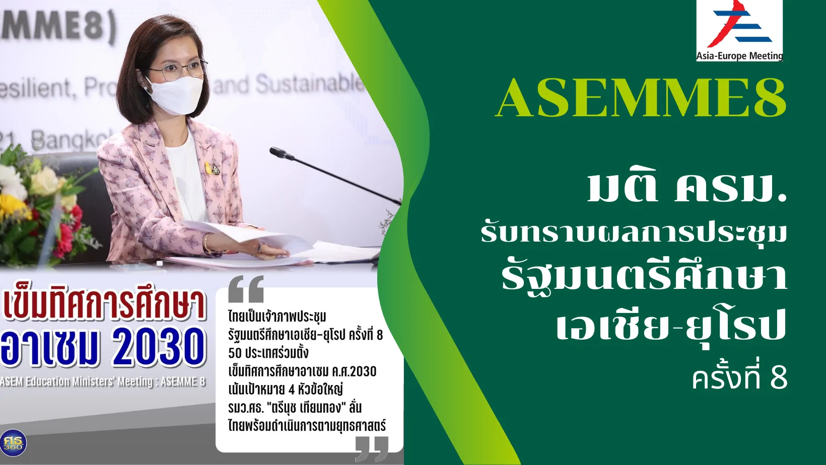 ครม.รับทราบผลการประชุมรัฐมนตรีศึกษาเอเชีย-ยุโรป ครั้งที่ 8 มติคณะรัฐมนตรี เมื่อวันที่ 22 มีนาคม 2565 รับทราบผลการประชุมรัฐมนตรีศึกษาเอเชีย-ยุโรป ครั้งที่ 8 และการประชุมที่เกี่ยวข้อง More Info :“ตรีนุช” ร่วมตั้งเข็มทิศกา...