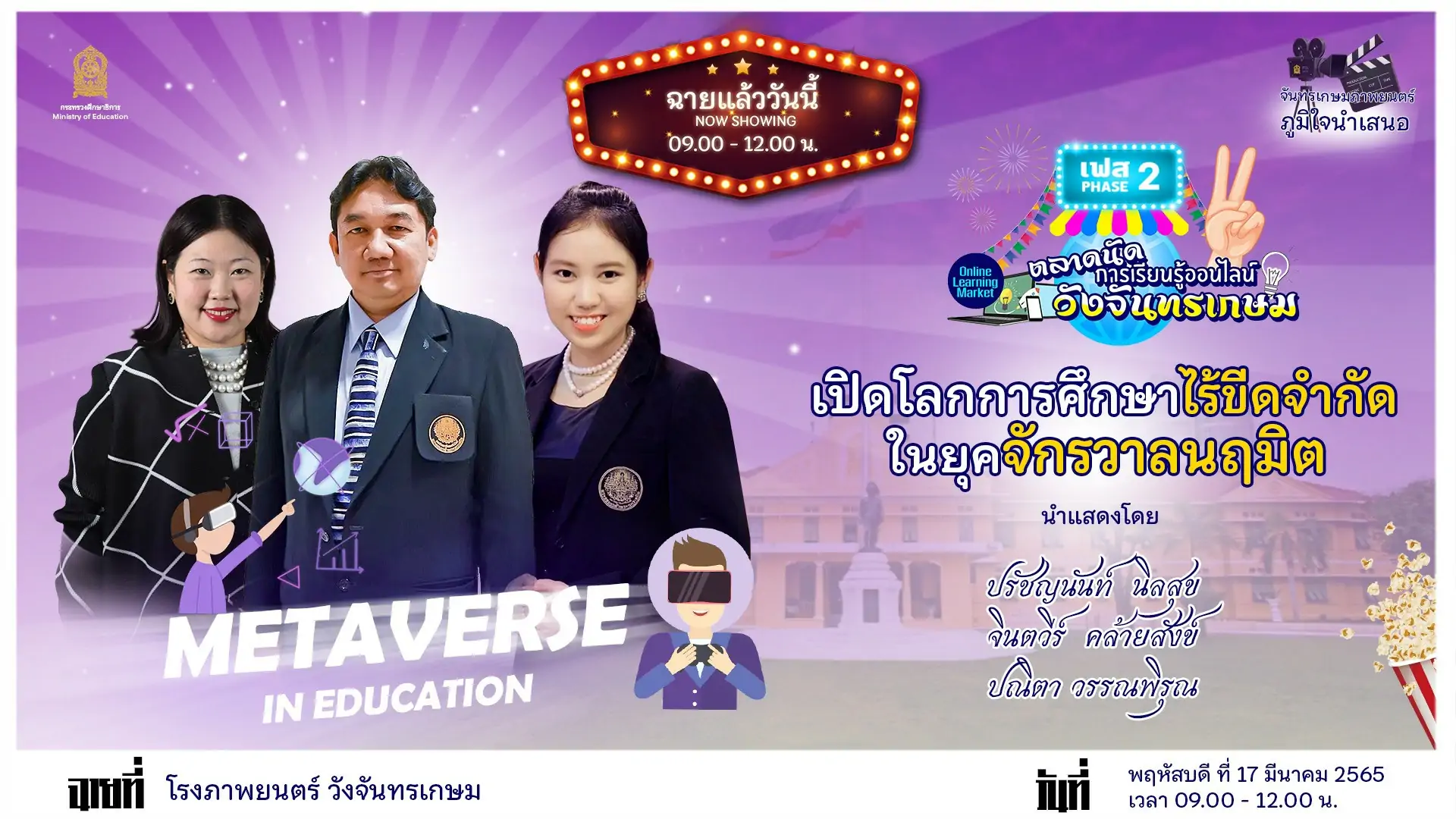 ศธ.เปิดตลาดนัดการเรียนรู้ออนไลน์วังจันทรเกษม หลักสูตรที่ 3 ‘Metaverse in Education’ ลงทะเบียนอบรม 7.2 หมื่นคน 17 มีนาคม 2565 – ดร.สุภัทร จำปาทอง ปลัดกระทรวงศึกษาธิการ (ศธ.) เป็นประธานเปิดตลาดนัดการเรียนรู้ออนไลน์วังจันทร...
