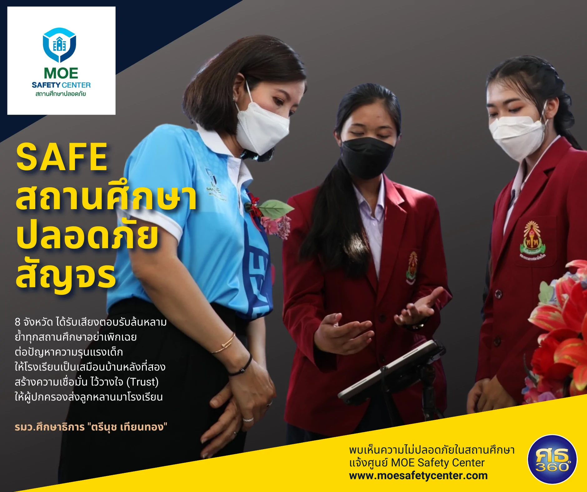 “SAFE สถานศึกษาปลอดภัย สัญจร” 8 จังหวัด รมว.ศธ. “ตรีนุช เทียนทอง” ปลื้ม SAFE สถานศึกษาปลอดภัย สัญจร 8 จังหวัด ได้รับเสียงตอบรับล้นหลาม ย้ำทุกสถานศึกษาอย่าเพิกเฉยต่อปัญหาความรุนแรงเด็ก ให้โรงเรียนเป็นเสมือนบ้านหลังที่สอง ...