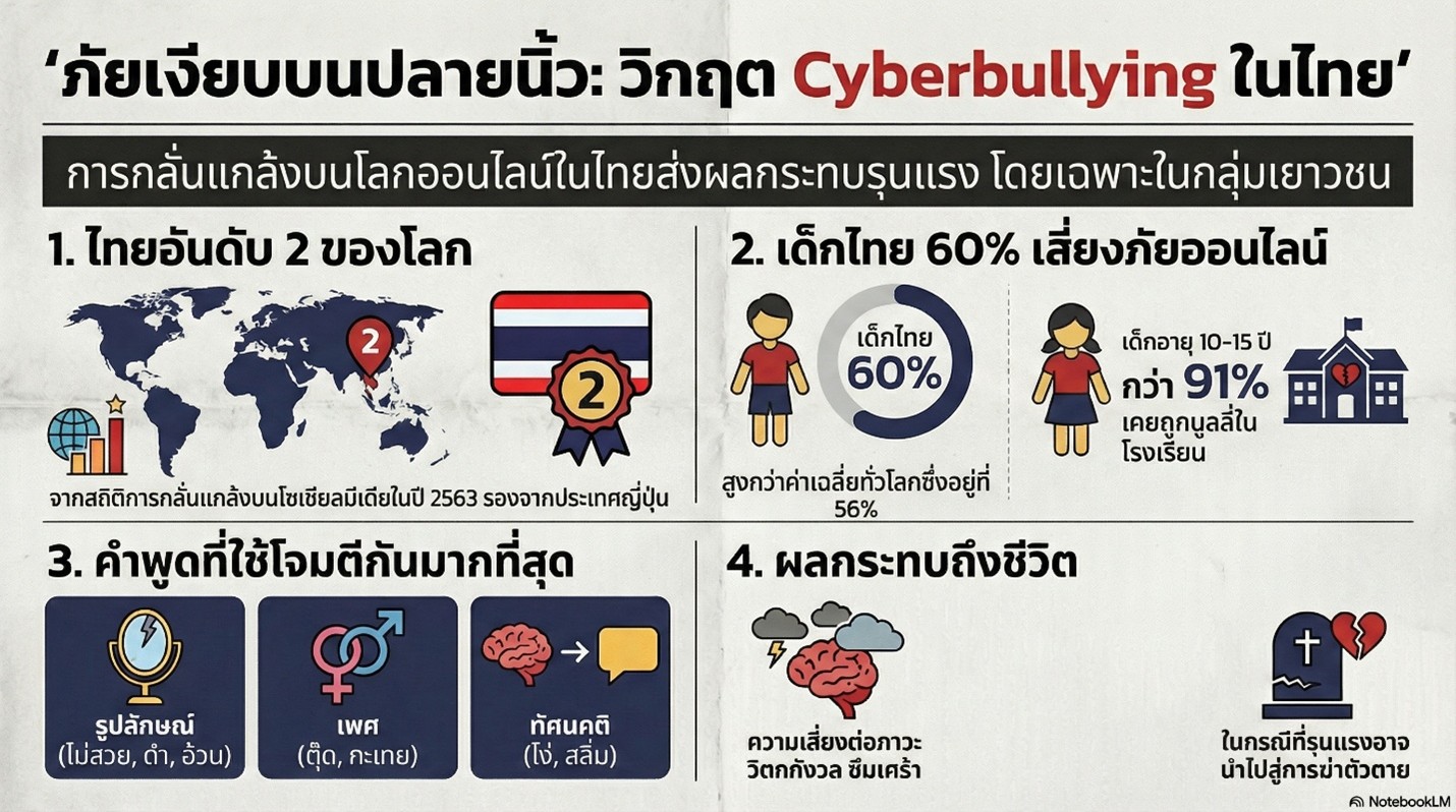 โลกในศตวรรษที่ 21 ได้กลายเป็นสังคมไร้พรมแดนที่เราเชื่อมต่อถึงกันผ่านเทคโนโลยีออนไลน์ ทำให้สามารถเข้าถึงข้อมูลข่าวสารและวัฒนธรรมจากทุกมุมโลกได้อย่างง่ายดาย เทคโนโลยีนี้ตอบสนองความต้องการพื้นฐานของมนุษย์ที่อยากเป็นส่วนหนึ่งของสังคม แต่ในขณะเดียวกันก็เปรียบเสมือนดาบสองคมที่เปิดช่องให้เกิดปัญหาใหญ่ที่เรียกว่า Cyberbullying หรือการกลั่นแกล้งบนโลกออนไลน์ ซึ่งเป็นการละเมิดสิทธิส่วนบุคคลในหลากหลายรูปแบบ และสร้างบาดแผลที่มองไม่เห็นให้กับผู้คนจำนวนมาก