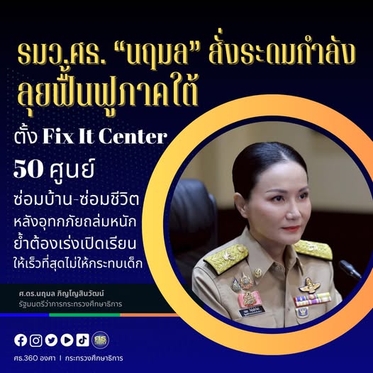 “รัฐมนตรีว่าการกระทรวงศึกษาธิการ ศ.ดร. นฤมล ภิญโญสินวัฒน์ ได้กำชับให้ทุกหน่วยงานเร่งลงพื้นที่ช่วยเหลือโรงเรียนทันที ทั้งการสำรวจและตรวจสอบความเสียหาย การทำความสะอาดและฟื้นฟูห้องเรียน การซ่อมแซมครุภัณฑ์ รวมถึงการประเมินความจำเป็นเร่งด่วนในพื้นที่ เพื่อให้การสนับสนุนทรัพยากรเป็นไปอย่างตรงจุดและทันต่อสถานการณ์ เป้าหมายสำคัญคือการให้โรงเรียนกลับมาเปิดเรียนได้อย่างปลอดภัย และให้นักเรียน–นักศึกษาสามารถเรียนรู้ต่อได้โดยไม่สะดุด กระทรวงศึกษาธิการพร้อมยืนเคียงข้างทุกคนในพื้นที่ประสบภัย และจะมุ่งช่วยเหลืออย่างเต็มกำลังในทุกมิติที่จำเป็น” โฆษกกระทรวงศึกษาธิการ กล่าว