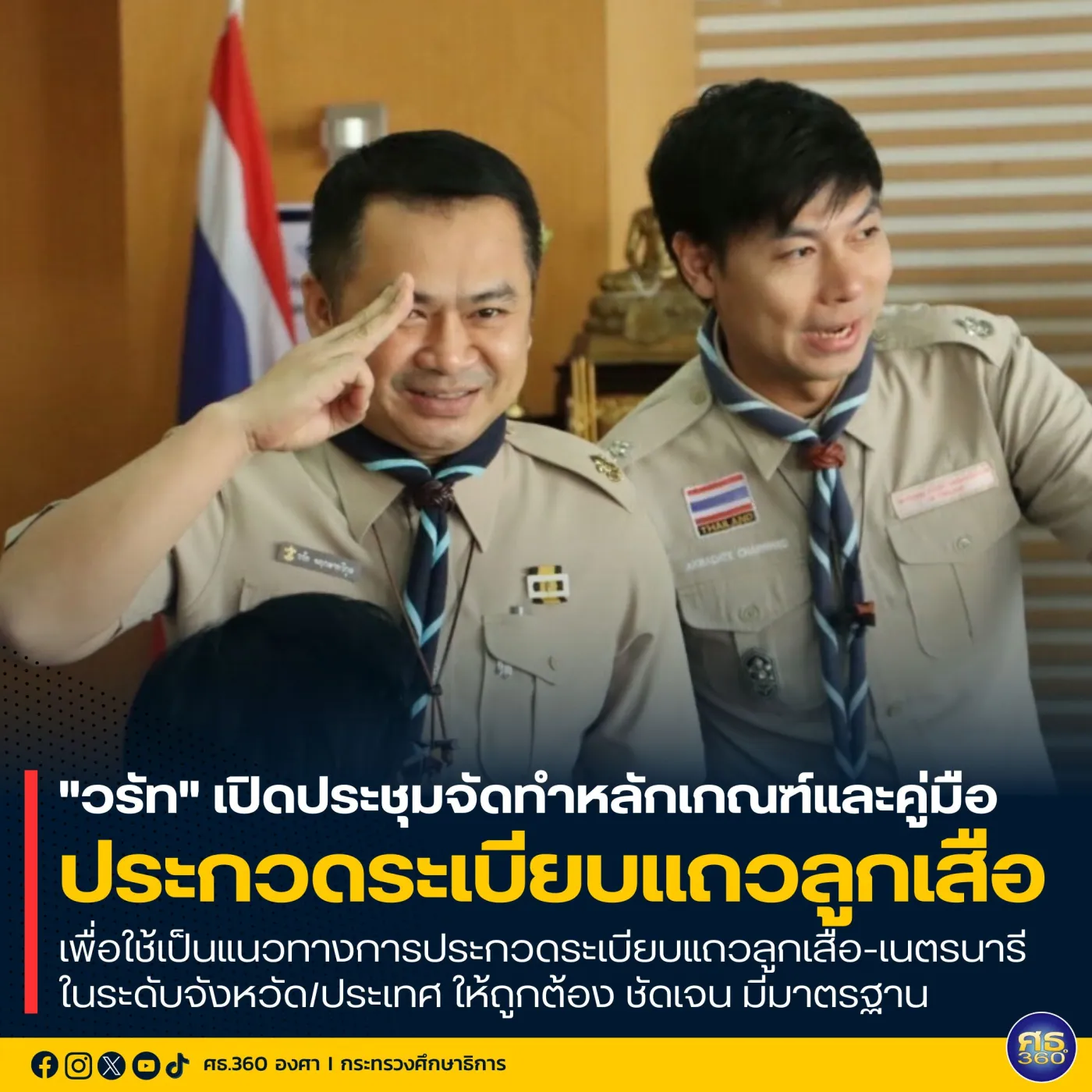 รองปลัด ศธ. กล่าวว่า รัฐมนตรีว่าการกระทรวงศึกษาธิการ (พลตำรวจเอก เพิ่มพูน ชิดชอบ) มีความคาดหวังอยากให้เด็กไทยมีคุณลักษณะ 3 เรื่อง ความมีวินัย ความซื่อสัตย์ และทักษะชีวิต ภายใต้กระบวนการลูกเสือ โดยขบวนการลูกเสือ (Scout Movement) หรือการลูกเสือ คือกลุ่มบุคคลที่ร่วมกันส่งเสริม สนับสนุน และสร้างสรรค์ให้เกิดพลังของเด็ก เยาวชน และคนหนุ่มสาว โดยวิธีลูกเสือ (Scout method) ซึ่งเป็นโปรแกรมการฝึกอบรมที่เพิ่มประสบการณ์การเรียนรู้ที่ตอบสนองความต้องการและความสนใจตามช่วงวัย โดยเน้นกิจกรรมกลางแจ้งที่สนุกสนาน ทันสมัย และสามารถนำไปใช้เหลือตนเอง ครอบครัว ชุมชน และสังคมได้จริง