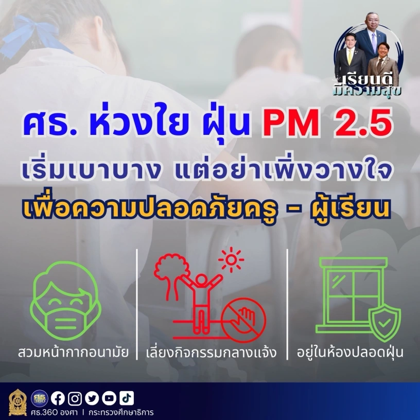 “กระทรวงศึกษาธิการ จะติดตามสถานการณ์ฝุ่น PM 2.5 อย่างใกล้ชิด และจะคอยสนับสนุนสถานศึกษาในการจัดทำแผนรับมืออย่างมีประสิทธิภาพ เพื่อให้การเรียนการสอนดำเนินควบคู่กับปลอดภัยและมีคุณภาพ ตามนโยบาย “เรียนดี มีความสุข” สุขทั้งผู้เรียน ทั้งครูและบุคลากรทางการศึกษา” โฆษก ศธ. กล่าว