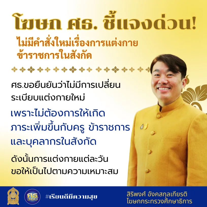 (21 ตุลาคม 2567) นายสิริพงศ์ อังคสกุลเกียรติ โฆษกกระทรวงศึกษาธิการ ได้ออกมาแถลงข่าวชี้แจงอย่างเป็นทางการ หลังมีการแชร์ภาพและข้อมูลที่สร้างความเข้าใจผิดเกี่ยวกับการแต่งกายของข้าราชการในสังกัดกระทรวงศึกษาธิการ โดยเฉพาะในกลุ่มข้าราชการครูทั่วประเทศ ซึ่งมีความสับสนว่ากระทรวงศึกษาธิการได้สั่งการให้มีการเปลี่ยนแปลงรูปแบบการแต่งกายสำหรับวันจันทร์ อังคาร และพุธ ตามแนวทางของกระทรวงมหาดไทยหรือไม่นั้น