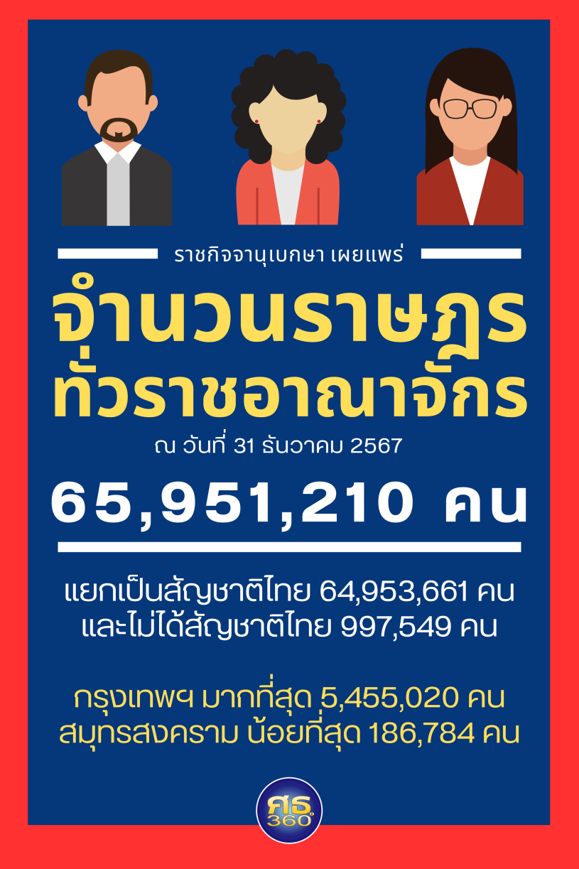 - จำนวนราษฎรทั่วประเทศ รวมทั้งสิ้น จำนวน 65,951,210 คน แยกเป็น