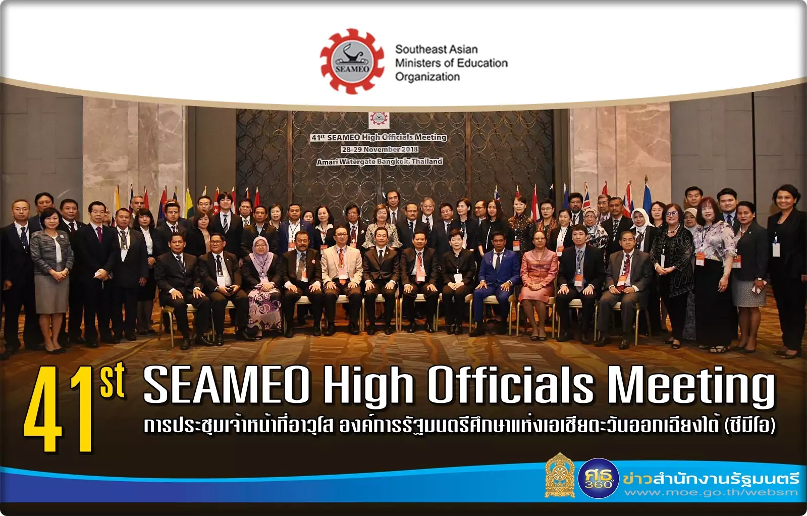 วันนี้ (28 พฤศจิกายน 2561) เวลา 9.00 น. องค์การรัฐมนตรีศึกษาแห่งเอเชียตะวันออกเฉียงใต้ (ซีมีโอ) จัดการประชุมเจ้าหน้าที่อาวุโส ครั้งที่ 41 (41st SEAMEO High Officials Meeting : HOM) ซึ่งกำหนดจัดขึ้นระหว่างวันที่ 28-29 พฤศจิกายน 2561 ณ โรงแรมอมารี วอเตอร์เกท กรุงเทพฯ โดย รศ.นพ.โศภณ นภาธร ผู้ช่วยรัฐมนตรีประจำกระทรวงศึกษาธิการ เป็นประธานเปิด และนางสาวดุริยา อมตวิวัฒน์ ผู้ตรวจราชการกระทรวงศึกษาธิการ เข้าร่วมพิธีเปิด