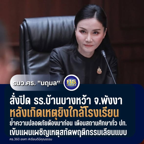 รมว.ศธ. “นฤมล” สั่งปิด รร.บ้านบางหว้า จ.พังงา หลังเหตุยิงใกล้โรงเรียน ย้ำความปลอดภัยต้องมาก่อน เตือนสถานศึกษาทั่ว ปท.เข้มแผนเผชิญเหตุ สกัดพฤติกรรมเลียนแบบ 20 กุมภาพันธ์ 2569 8 ครั้ง