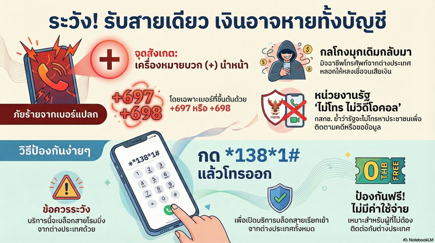 รับสายเดียวอาจเกลี้ยงบัญชี! ย้ำ 3 วิธีจับไต๋-ป้องกันมิจฉาชีพโทรจากต่างประเทศ 18 กุมภาพันธ์ 2569 12 ครั้ง