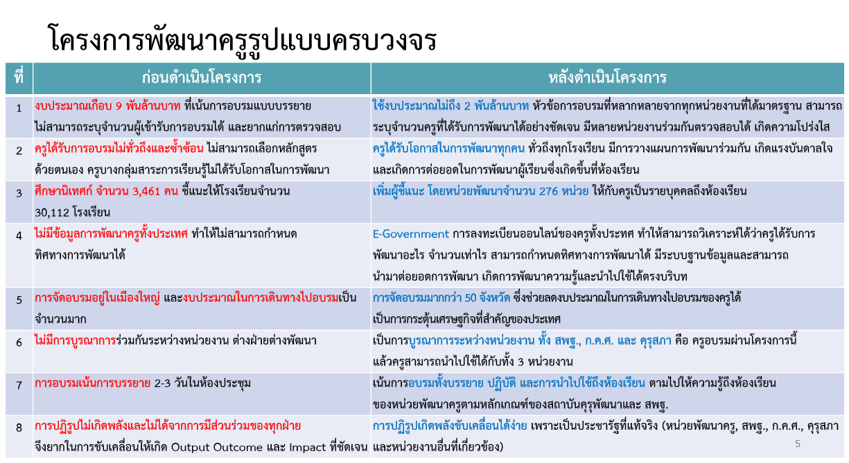 – โครงการพัฒนาครูรูปแบบครบวงจร (คูปองครู) ซึ่งถือเป็นการลดอำนาจจากส่วนกลาง ให้ครูมีสิทธิ์เลือกหลักสูตรที่จะอบรมผ่านระบบการลงทะเบียนออนไลน์ โดยมีส่วนกลางทำหน้าที่ควบคุมมาตรฐาน และเชิญชวนสถาบันอุดมศึกษาและภาคเอกชน มาเปิดหลักสูตรอบรมต่าง ๆ ที่ผ่านการพิจารณาจากสถาบันคุรุพัฒนา ทำให้ครูได้อบรมในหลักสูตรตามความถนัดและความสนใจของตน ไม่ใช่การอบรมรูปแบบเดียวกันทุกปี อีกทั้งชั่วโมงการอบรมยังเชื่อมโยงกับวิทยฐานะด้วย