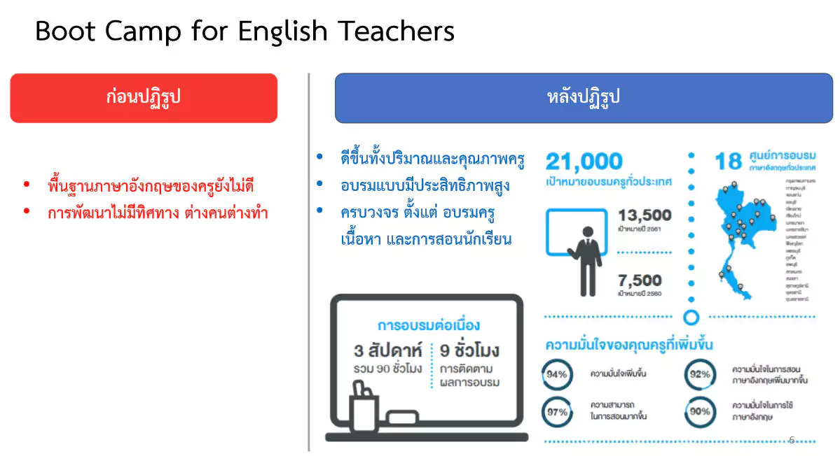 – การอบรมครูผู้สอนภาษาอังกฤษชาวไทย (Boot Camp for English Teachers) ซึ่งเป็นโครงการที่พัฒนาทักษะการสอนภาษาอังกฤษให้กับครูชาวไทย โดยมีผลการดำเนินงานทั้งในด้านปริมาณและคุณภาพ กล่าวคือ ในปี 2560 ได้อบรมครูภาษาอังกฤษ จำนวน 7,500 คน และในปี 2561 อบรมครูภาษาอังกฤษ จำนวน 13,500 คน อีกทั้งได้จัดตั้งศูนย์ Boot Camp ในระดับภูมิภาค จำนวน 15 ศูนย์ทั่วประเทศ นอกจากนี้ ครูที่เข้ารับการอบรมมีความมั่นใจในการใช้ภาษาอังกฤษมากขึ้น และมีทักษะการสอนภาษาอังกฤษในชั้นเรียนดีขึ้น