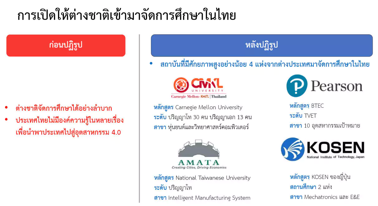 – การเปิดกว้างให้สถาบันการศึกษาจากต่างประเทศเข้ามาร่วมจัดการศึกษาในประเทศไทย เนื่องจากการพัฒนาประเทศให้กลายเป็นประเทศไทย 4.0 นั้น ควรมีความร่วมมือจากต่างชาติเพื่อเข้ามาร่วมกันพัฒนาด้านต่าง ๆ โดยปัจจุบันมีสถาบันการศึกษาต่างประเทศที่มีศักยภาพสูงเข้ามาจัดการศึกษาในประเทศไทย เช่น Carnegie Mellon University สหรัฐอเมริกา ร่วมกับสถาบันเทคโนโลยีพระจอมเกล้าเจ้าคุณทหารลาดกระบัง เปิดสอนหลักสูตรปริญญาโทและปริญญาเอกในสาขา Robotics และ Computer Science, National Taiwan University ร่วมกับมหาวิทยาลัยอมตะ เปิดสอนหลักสูตรปริญญาโทสาขาวิชา Intelligent Manufacturing System, Pearson สหราชอาณาจักร ร่วมกับสำนักงานคณะกรรมการการอาชีวศึกษา เปิดสอนหลักสูตร BTEC ในสาขาวิชาด้าน 10 อุตสาหกรรมเป้าหมายของประเทศ และ National Institute of Technology, Japan หรือ KOSEN ที่จะเข้ามาจัดตั้งสถาบัน KOSEN จำนวน 2 แห่ง เปิดสอนหลักสูตร Electrical Engineering (E&E)