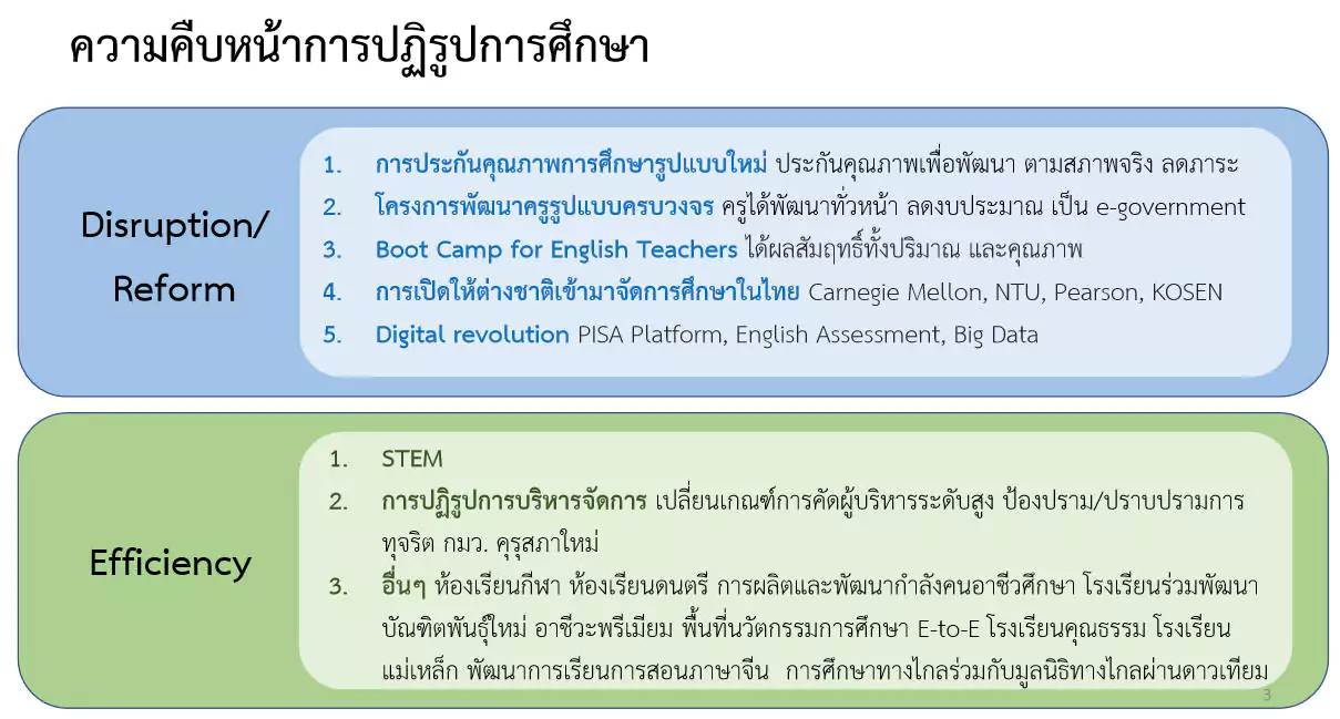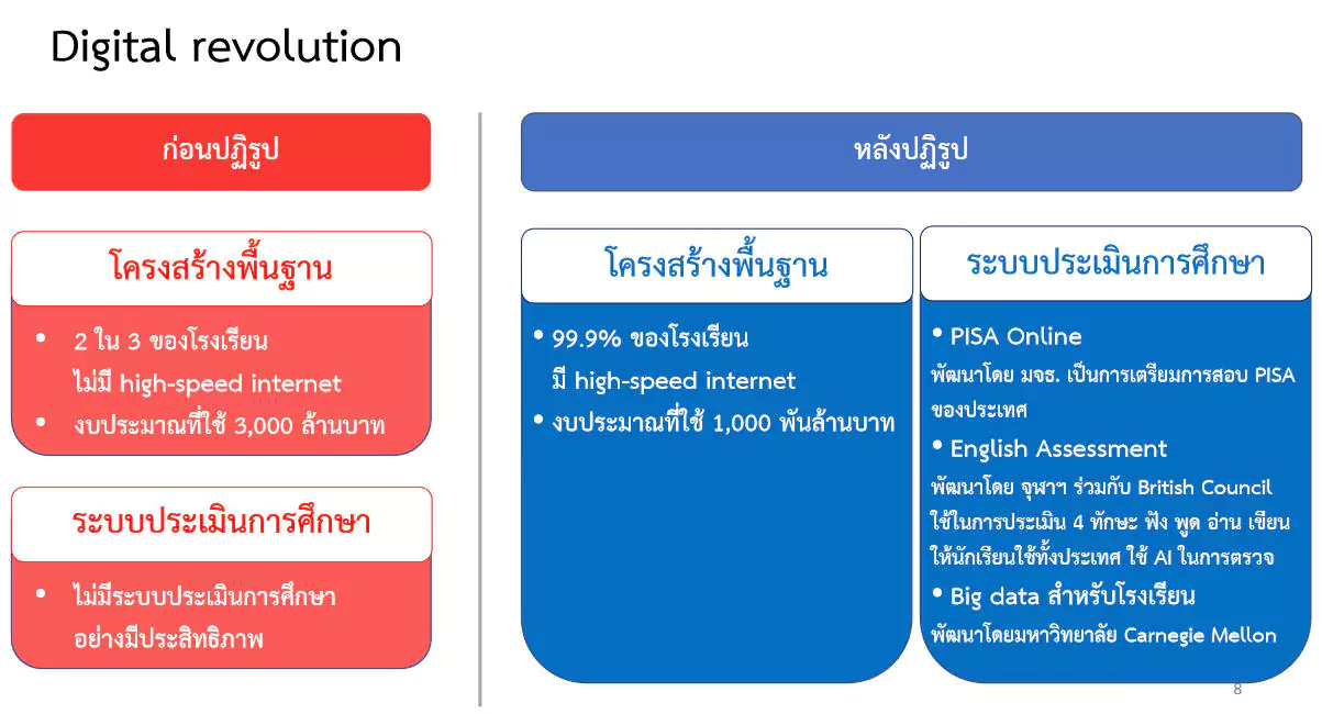 – การปฏิวัติด้านดิจิทัล จากในอดีตที่ ศธ. ใช้งบประมาณเกี่ยวกับโครงสร้างพื้นฐานในสถานศึกษากว่า 3 พันล้านบาท ในขณะที่โรงเรียน 2 ใน 3 ของโรงเรียนทั้งหมดไม่มีอินเทอร์เน็ตความเร็วสูงใช้จัดการเรียนการสอน แต่เมื่อทำการปฏิรูปด้านดิจิทัล ส่งผลให้โรงเรียนร้อยละ 99 มีอินเทอร์เน็ตความเร็วสูงใช้ในการบริหารจัดการและจัดการเรียนการสอน นอกจากนี้ ยังได้ดำเนินโครงการ PISA Online, Online English Assessment และการจัดทำฐานข้อมูล (Big Data) สำหรับสถานศึกษาด้วย