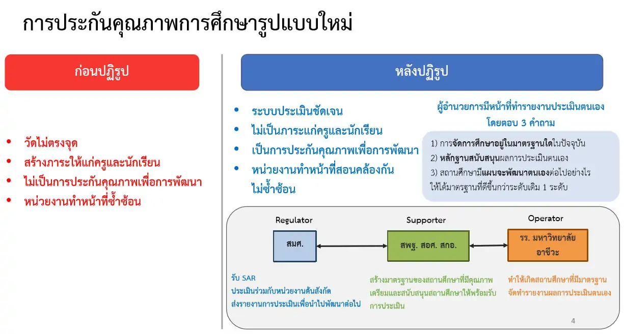 – วางระบบการประกันคุณภาพการศึกษารูปแบบใหม่ เพื่อประเมินคุณภาพการศึกษาที่เป็นจริง ลดภาระงานของครู และนำผลการประเมินไปต่อยอดพัฒนาสถานศึกษาได้ โดยผู้อำนวยการโรงเรียนจะเป็นผู้ประเมินโรงเรียน ด้วยการเขียนรายงานเพื่อตอบคำถาม 3 ข้อ คือ ปัจจุบันโรงเรียนมีมาตรฐานการศึกษาอยู่ในระดับใด, มีหลักฐานหรือข้อพิสูจน์ใดที่แสดงว่าโรงเรียนมีคุณภาพหรือมาตรฐานในระดับนั้น และโรงเรียนมีแนวทางในการพัฒนาคุณภาพให้มีมาตรฐานที่สูงขึ้นได้อย่างไร โดยสิ่งเหล่านี้จะช่วยให้โรงเรียนและหน่วยงานต้นสังกัดทราบคุณภาพการศึกษาในปัจจุบัน และสามารถวางแนวทางในการพัฒนาสถานศึกษานั้น ๆ ได้