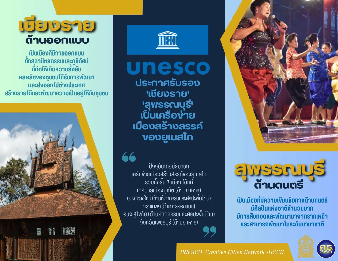 พลตำรวจเอก เพิ่มพูน ชิดชอบ รัฐมนตรีว่าการกระทรวงศึกษาธิการ ในฐานะประธานคณะกรรมการแห่งชาติว่าด้วยการศึกษา วิทยาศาสตร์ และวัฒนธรรมแห่งสหประชาชาติ (UNESCO: ยูเนสโก) เปิดเผยว่า เมื่อวันอังคารที่ 31 ตุลาคม ซึ่งสหประชาชาติได้กำหนดให้เป็นวันเมืองโลก (World Cities Day) องค์การยูเนสโกได้ประกาศรับรอง 55 เมืองทั่วโลก เข้าร่วมเป็นเครือข่ายเมืองสร้างสรรค์ของยูเนสโก (UNESCO Creative Cities Network -UCCN) ซึ่งรวมถึง 2 เมืองของไทย ได้แก่ จังหวัดเชียงราย (ด้านออกแบบ) และจังหวัดสุพรรณบุรี (ด้านดนตรี)