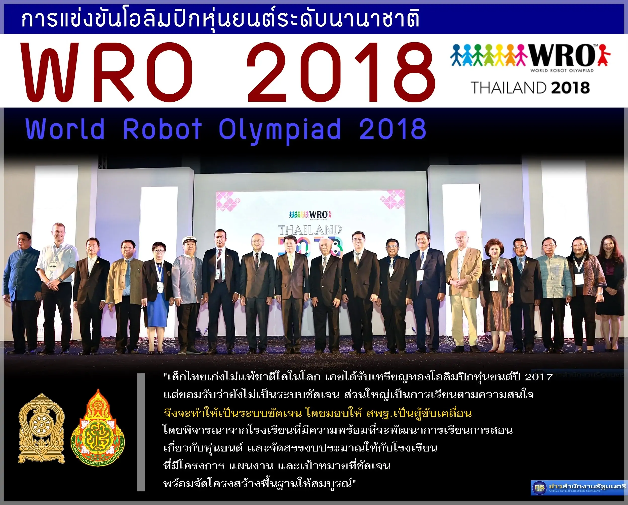 นพ.ธีระเกียรติ เจริญเศรษฐศิลป์ รัฐมนตรีว่าการกระทรวงศึกษาธิการ เป็นประธานพิธีเปิดโครงการแข่งขันโอลิมปิกหุ่นยนต์ระดับนานาชาติ “WRO 2018 : World Robot Olympiad 2018” เมื่อวันศุกร์ที่ 16 พฤศจิกายน 2561 ณ ศูนย์ประชุมนานาชาติเฉลิมพระเกียรติ 7 รอบพระชนมพรรษา จังหวัดเชียงใหม่ โดยมี รศ.นพ.โศภณ นภาธร ผู้ช่วยรัฐมนตรีประจำกระทรวงศึกษาธิการ, พล.ท.โกศล ปทุมชาติ ที่ปรึกษารัฐมนตรีว่าการกระทรวงศึกษาธิการ, Mr King Hui Laws ประธานคณะกรรมการ World Robot Olympiad, ผศ.ดร.รวิน ระวิวงศ์ ผู้อำนวยการองค์การพิพิธภัณฑ์วิทยาศาสตร์แห่งชาติ (อพวช.), ดร.บุญรักษ์ ยอดเพชร เลขาธิการคณะกรรมการการศึกษาขั้นพื้นฐาน, ผู้บริหารกระทรวงศึกษาธิการ ตลอดจนผู้เข้าร่วมแข่งขัน ครู และผู้ปกครอง