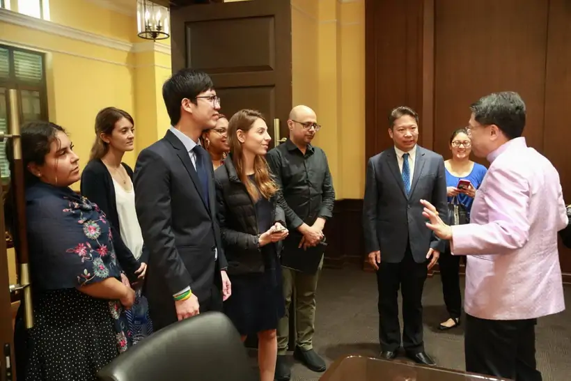 รศ.ดร.จอมพงศ์ มงคลวนิช รองอธิการบดีด้านบริหารและการให้บริการแก่สังคม ผู้อำนวยการสถาบันวิทยาการเพื่อการแข่งขัน มหาวิทยาลัยสยาม นำคณะนักศึกษาบัณฑิตวิทยาลัยจากมหาวิทยาลัยฮาวาร์ด (Harvard University) สหรัฐอเมริกา เข้าเยี่ยมคารวะ นพ.ธีระเกียรติ เจริญเศรษฐศิลป์ รัฐมนตรีว่าการกระทรวงศึกษาธิการ เมื่อวันอังคารที่ 19 มีนาคม 2562 ณ ห้องประชุมวชิราวุธ กระทรวงศึกษาธิการ